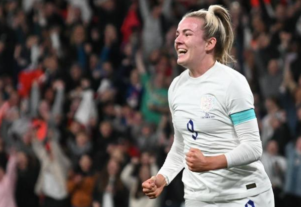 英格兰队的劳伦·汉普祝贺英格兰队 2-1 战胜美国队的球迷