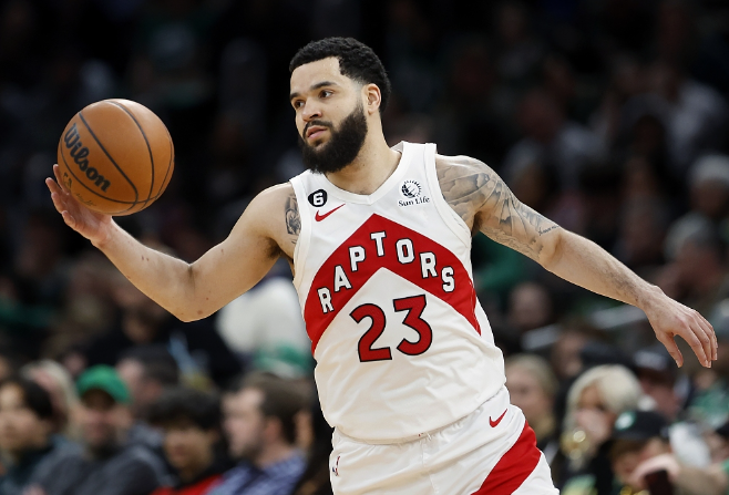 吉祥坊多伦多猛龙队的弗雷德·范弗利特在对阵波士顿凯尔特人队的比赛中运球。