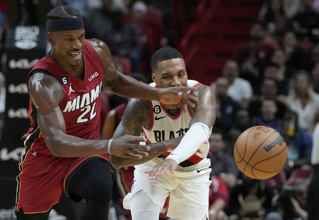 波特兰开拓者队的达米安·利拉德和迈阿密热火队的吉米·巴特勒在凯西中心争夺球权。