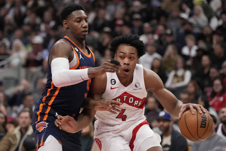 吉祥坊APP纽约尼克斯队的RJ Barrett在比赛中防守多伦多猛龙队的斯科蒂·巴恩斯。