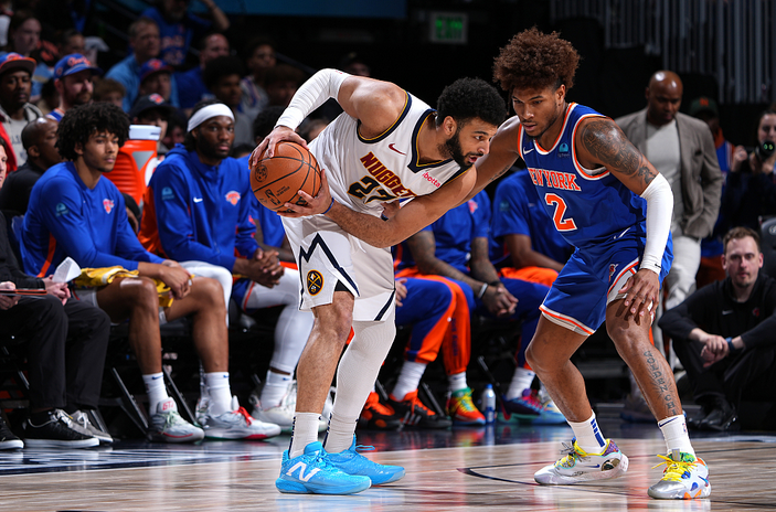 纽约尼克斯队的迈尔斯·麦克布莱德后卫丹佛掘金队的贾马尔·穆雷在比赛中。