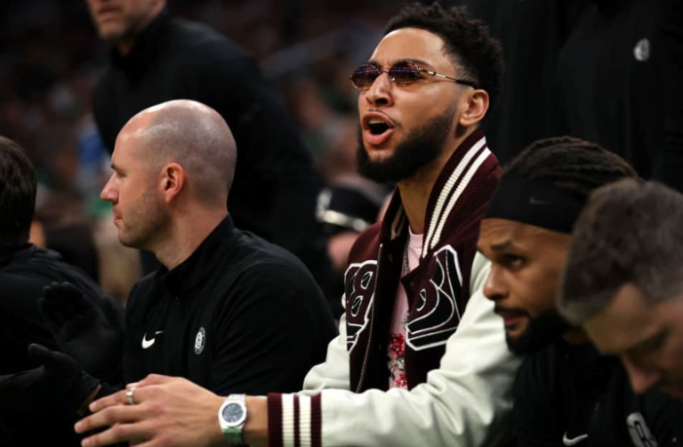 在与休斯顿火箭队的比赛中,布鲁克林篮网队的本西蒙斯坐在替补席上。