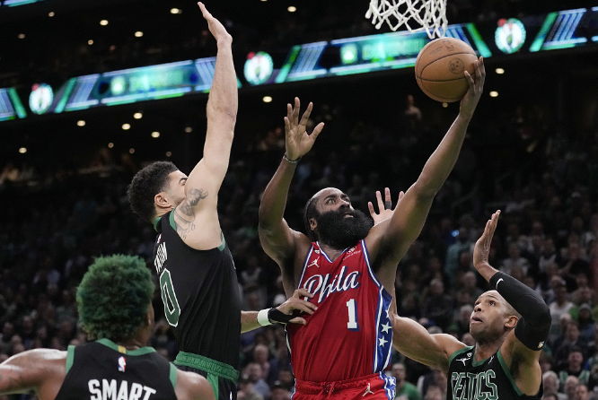 吉祥坊费城 76 人队的詹姆斯哈登在 NBA 东部半决赛第一场比赛中上场。