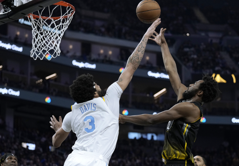 NBA 亮点:吉祥坊洛杉矶湖人队的安东尼戴维斯尝试上篮对抗金州勇士队的安德鲁威金斯