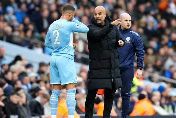 吉祥坊曼城主教练佩普·瓜迪奥拉在土耳其伊斯坦布尔阿塔图尔克奥林匹克体育场对阵国际米兰的欧洲冠军联赛决赛中向凯尔·沃克提供建议,